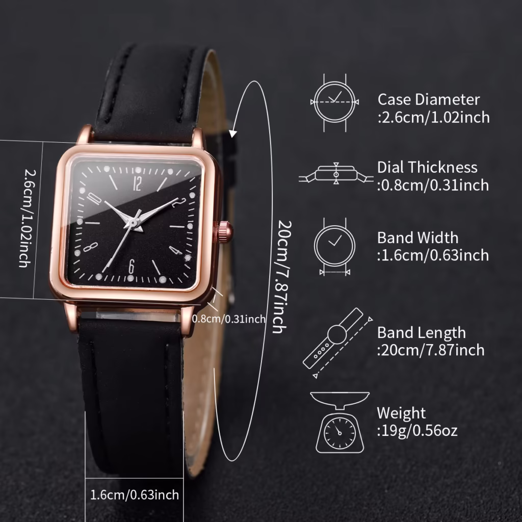 • ✨ إطلالة متناسقة: ساعات مربعة مع أساور متدلية.