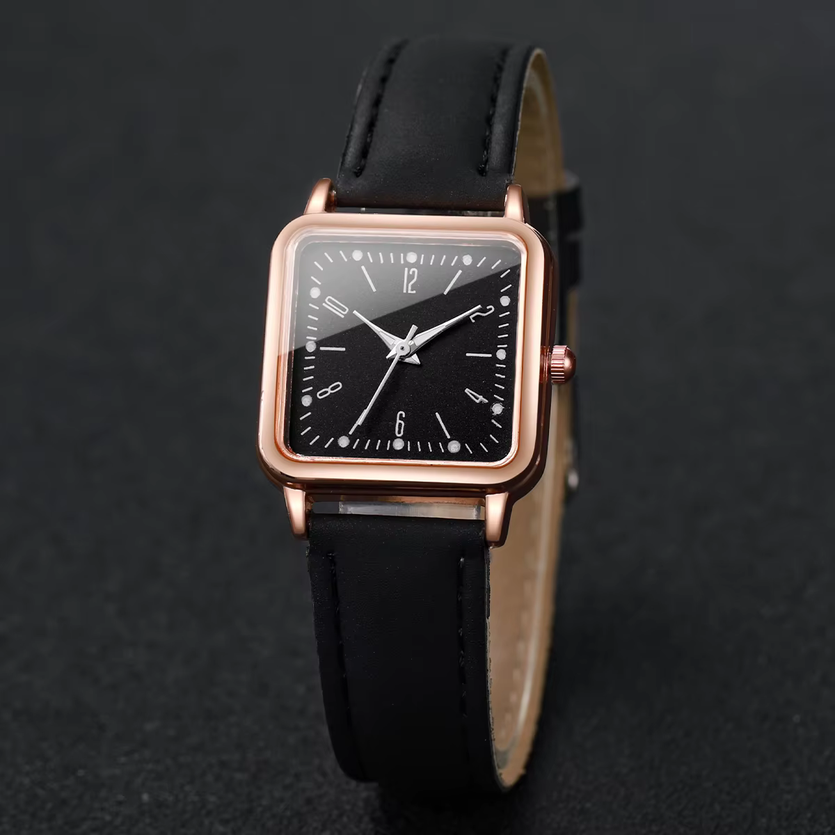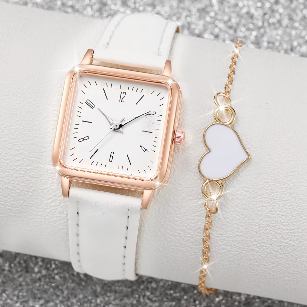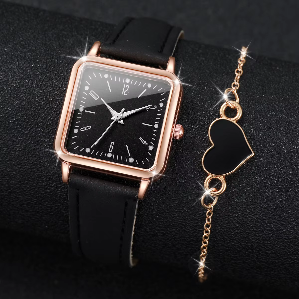 مجموعة ساعات كوارتز نسائية مربعة أنيقة بسوار جلدي وسوار على شكل قلب